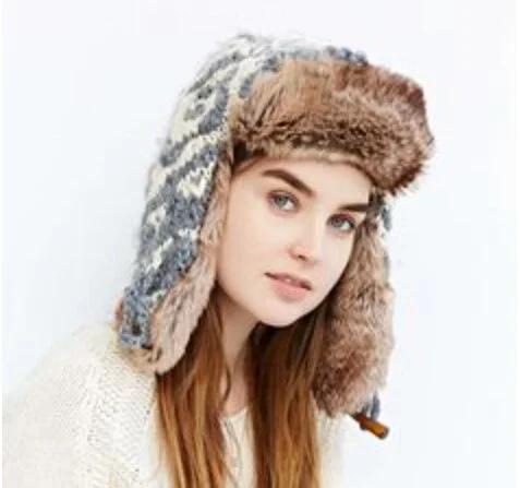 Intarsia knit beanie designed with a faux fur trim and lining. Closures were faux leather loop and wooden button.